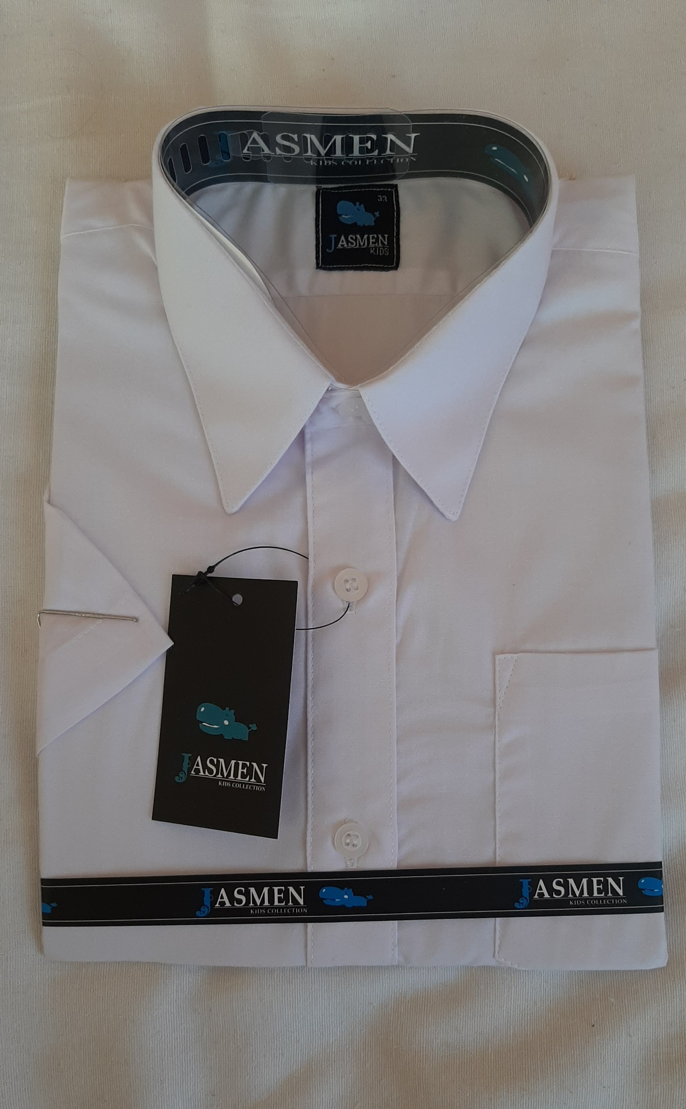 Wizytowa koszula chłopięca w kolorze białym. Koszula z krótkim rękawem, zapinana na guziki, kołnierzyk na stójce zapinany pod samą szyją. Na lewej piersi kieszonka. Koszula idealnie nadaje się na rozpoczęcie roku szkolnego lub jako dodatek do eleganckich spodni i marynarki.